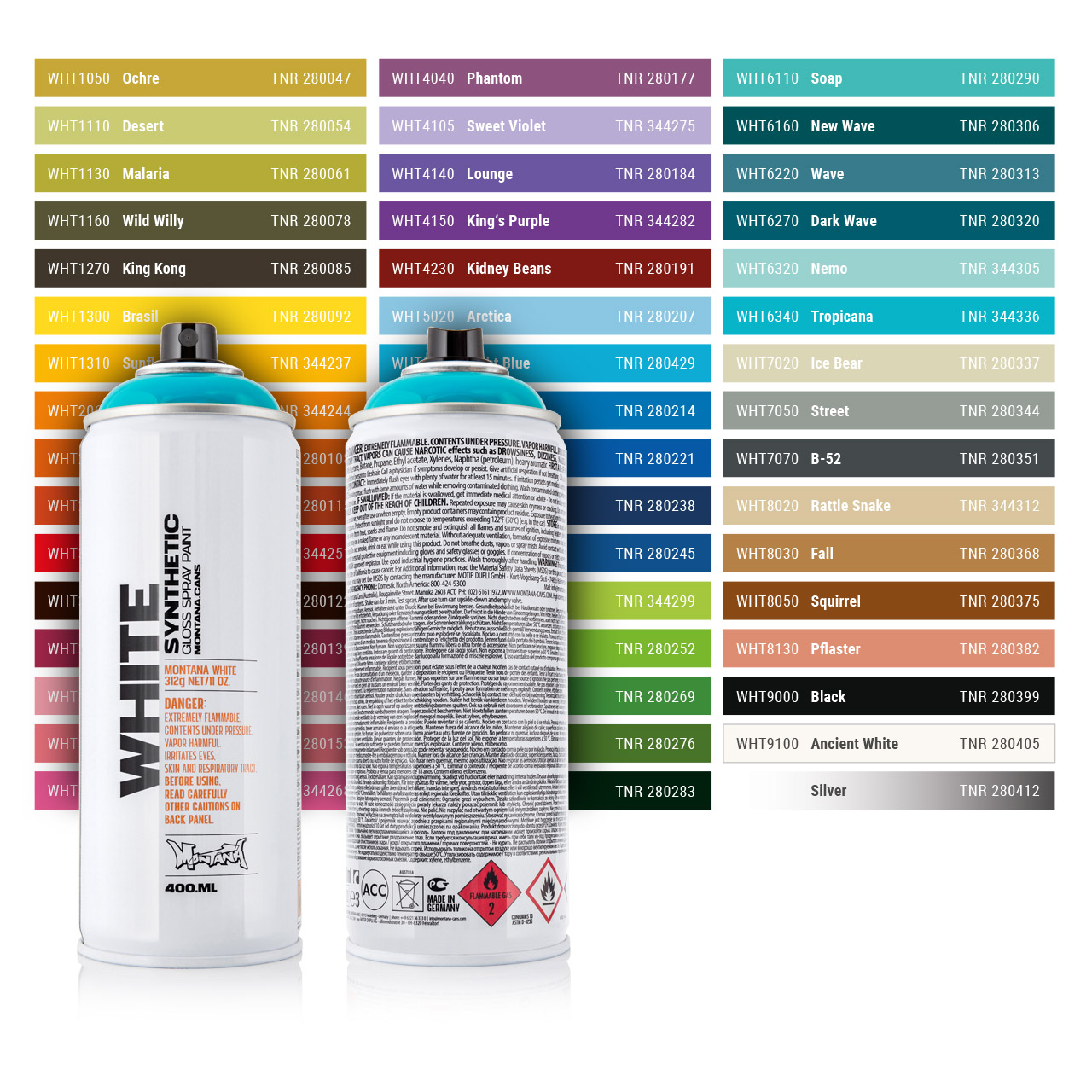 Download the pdf of the Montana WHITE color chart flyer. The PDF shows all colors of Montana WHITE 400ml Spray paint.